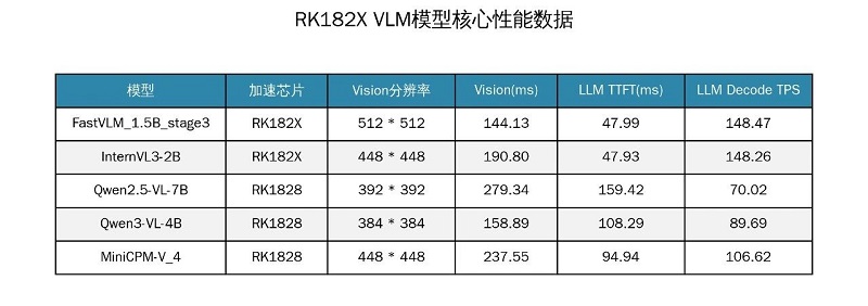 *不同 VLM 模型在 RK182X 上的核心性能数据如下: