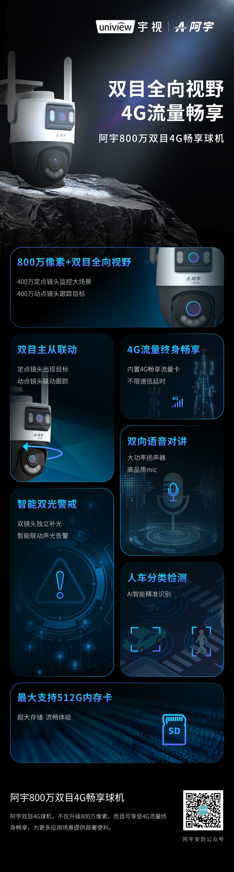 阿宇800万双目4G畅享球机:双目全向视野,4G流量畅享