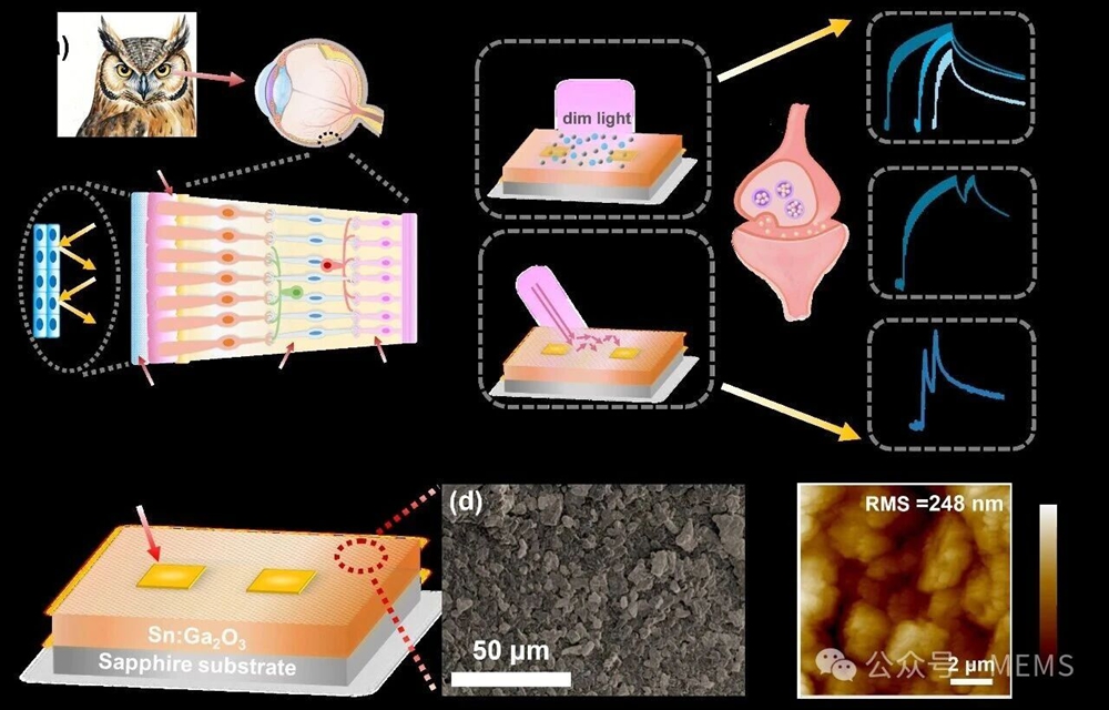 针对传统的人工视觉系统在灵敏度与算力消耗上的矛盾,南京邮电大学团队采用了晶界缺陷工程策略,制备了具有丰富晶界网络的粗糙Sn:Ga2O3多晶薄膜。该结构在物理层面模拟了猫头鹰的夜视功能,粗糙的晶粒表面通过漫反射延长光程,模拟了猫头鹰眼球后方照膜层的光陷阱效应,而高密度的晶界势垒则通过载流子俘获机制,模拟了视杆细胞对微弱信号的级联放大功能。