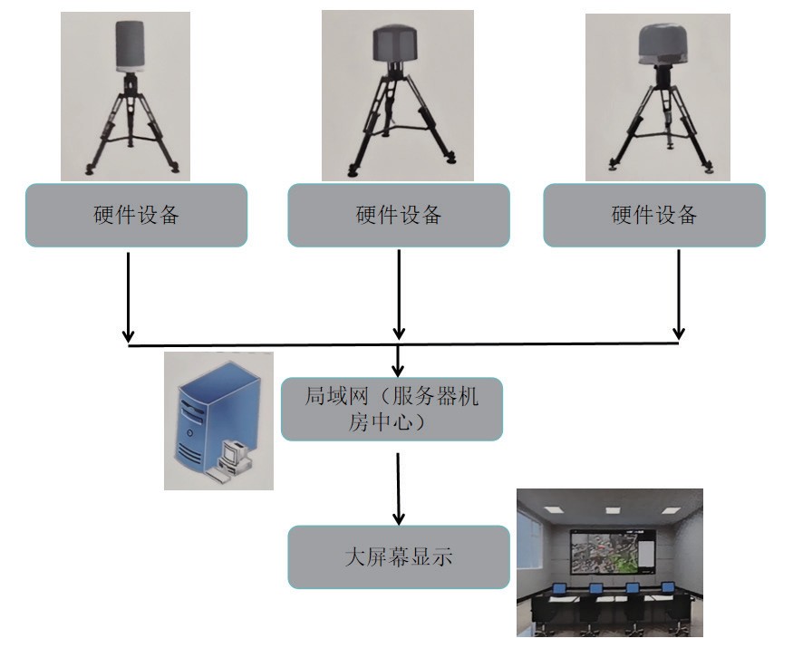 分布式多源信息融合的无线电探测与定位系统架构图:通过分布式部署,覆盖暑期安保重点区域;通过指控平台,能够获取各点位设备运行状态、值守模式、黑白名单处置、历史记录查询等信息,实时掌握低空安全态势。