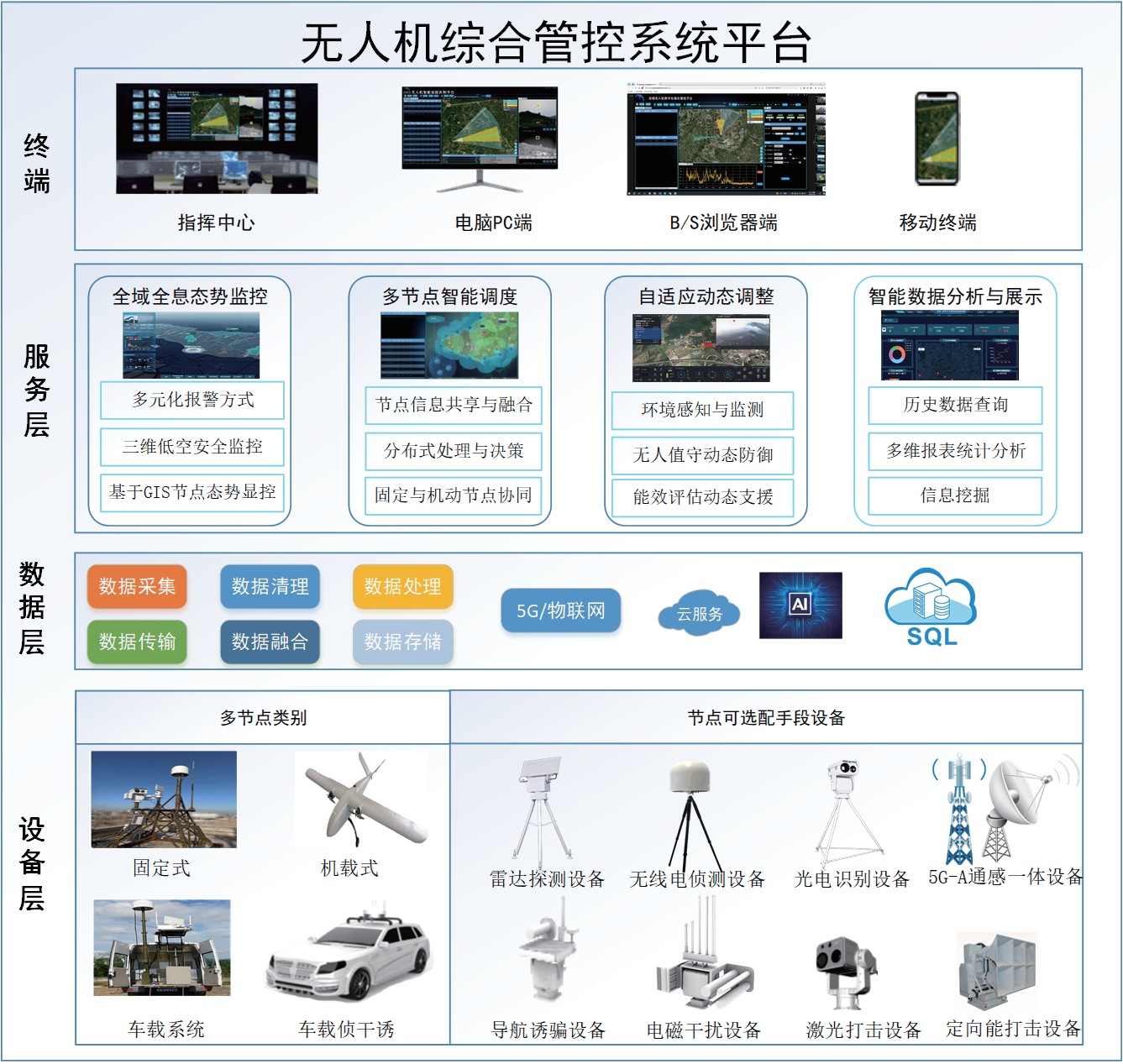 系统包括全域全息态势监测、多节点智能调度、系统自适应动态与调整及智能数据分配展示等模块,分为设备层、数据层、服务层和终端层。